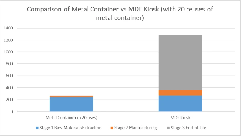 Παρότι το container-booth έχει υψηλότερες εκπομπές στην αρχική παραγωγή, η επαναχρησιμοποίησή του δίνει καθαρό πλεονέκτημα: